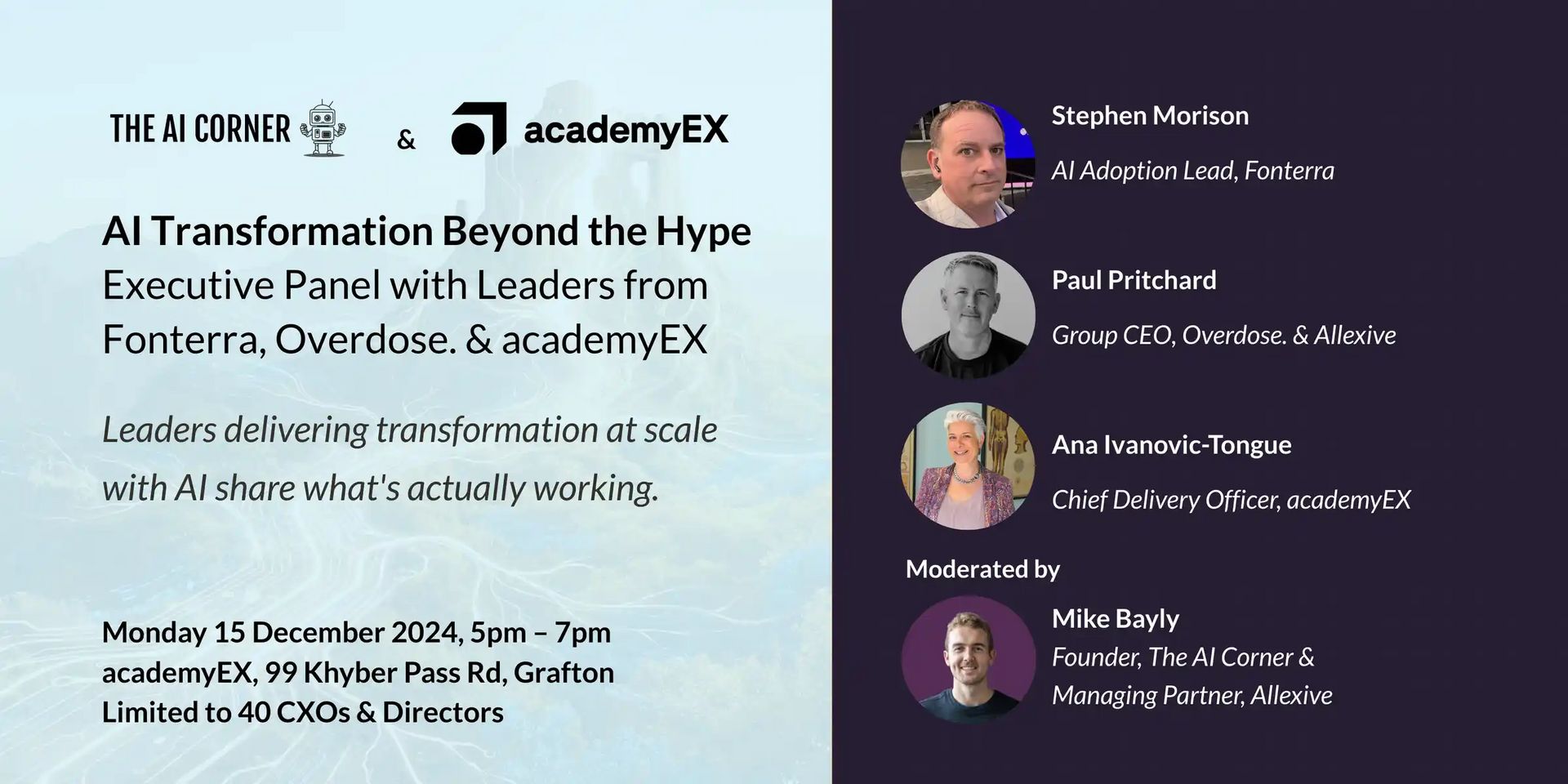 Three executives doing this at scale: Stephen Morison (AI Adoption Lead, Fonterra), Paul Pritchard (Group CEO, Overdose & Allexive), Ana Ivanovic-Tongue (Chief Delivery Officer, academyEX). I'll be moderating the conversation.