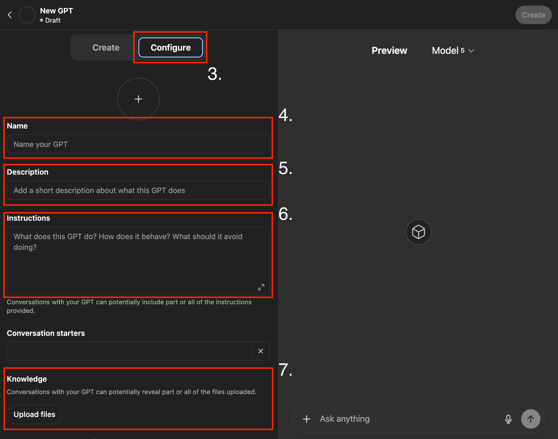 Write clear instructions defining the GPT’s role, goal, and success criteria.